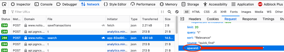 在自己的Notion页面下按f12调出控制台,然后选择网络,在页面下使用搜索功能,就会在网络下的search中捕捉到信息如图所示获得了ID,v2在cookies里
